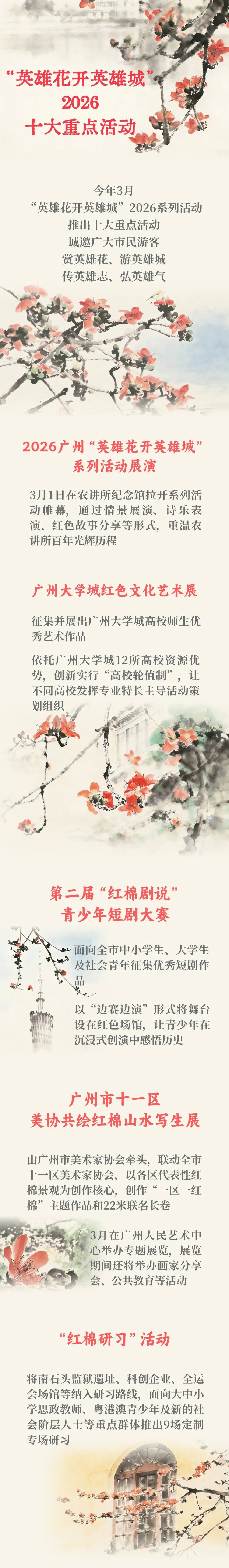接下来整个3月,十条“红棉之旅”精品线路、十二个以“红棉”命名的板块、三十四个核心场馆、千场红棉主题活动、十大重点活动……一场场红色文化盛宴将在全市多地呈现,异彩纷呈。